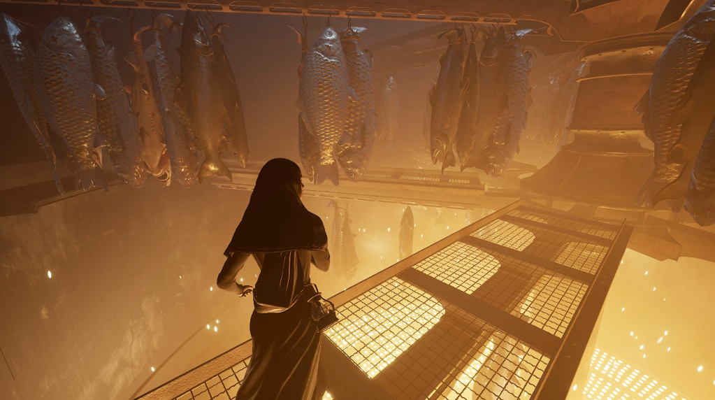 The environments are peppered with strange, almost poetic clutter. Tin cans stacked like offerings, fish hanging in places they shouldn’t be. These details aren’t explained, but they linger, adding to the sense that Indika’s world is stitched together from memory, metaphor, and quiet madness.