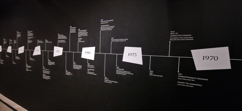I knew Tim Burton had worked closely with Disney. His fingerprints are all over the studio’s darker, more eccentric turns (and many of my personal favorites) such as Alice in Wonderland, The Nightmare Before Christmas, even the feature-length Frankenweenie. But what I didn’t know, until I stood reading the exhibition’s timeline, was how rocky that relationship had been at the start.