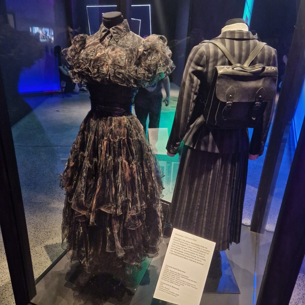 Nearby, Wednesday Addams’ Rave’N dance dress from the 2022 Netflix series hung with quiet defiance. Black chiffon, layered and sharp.